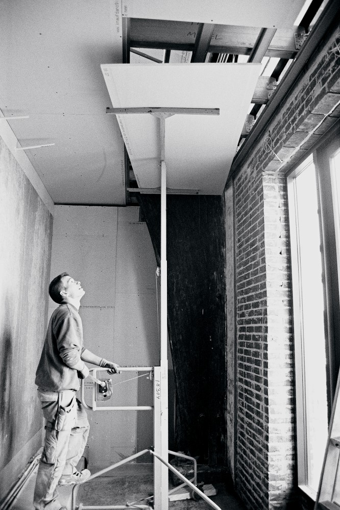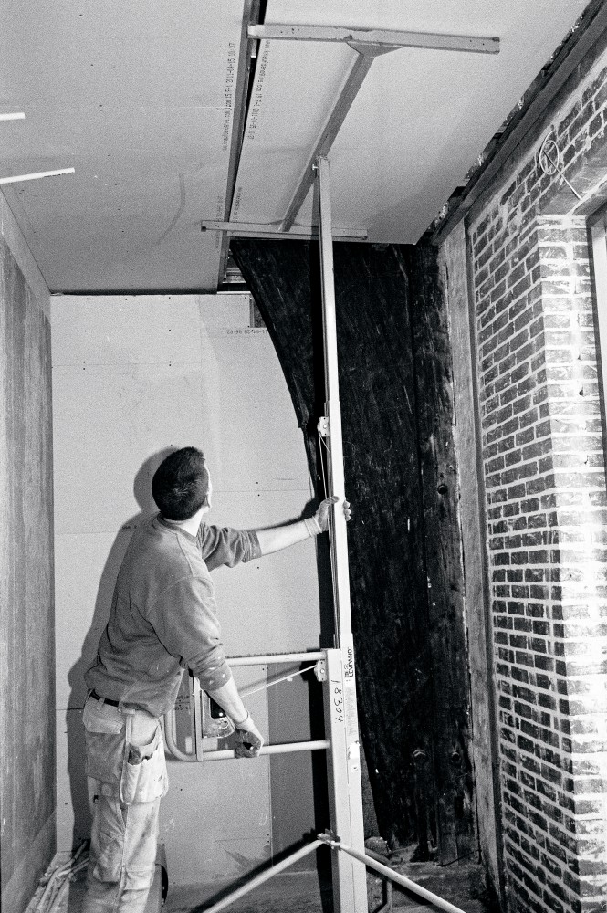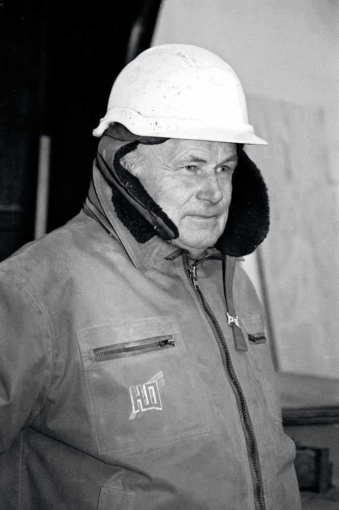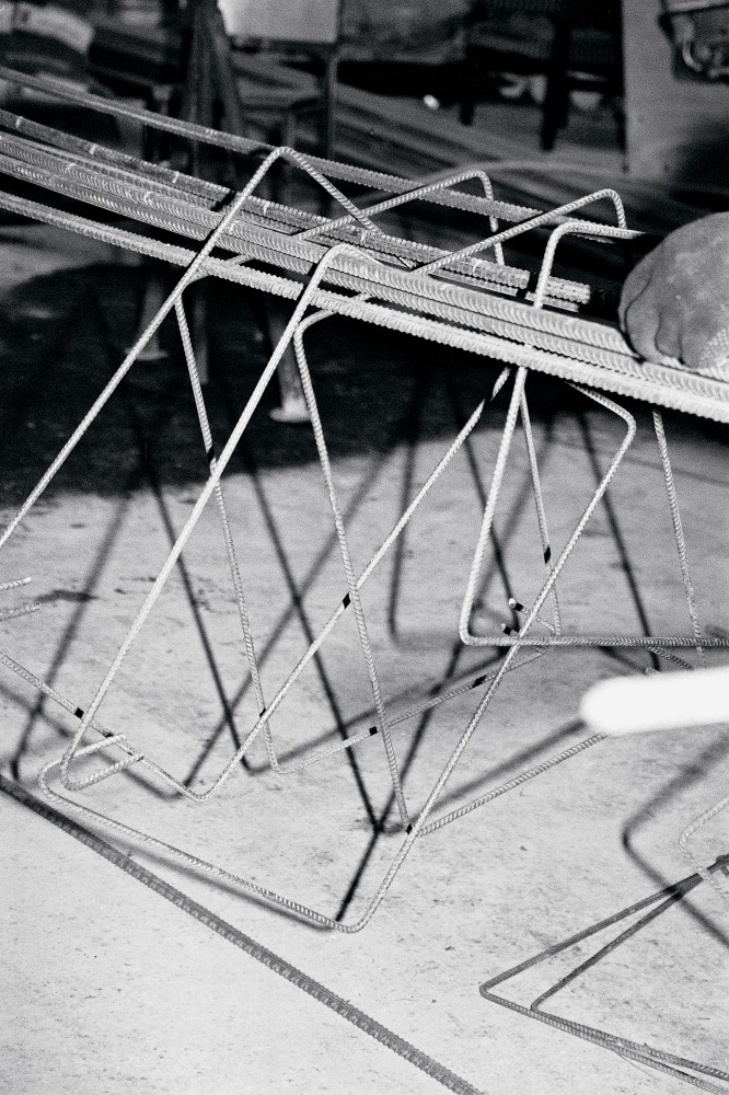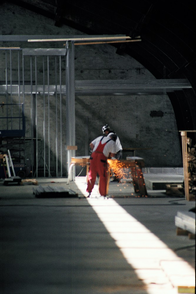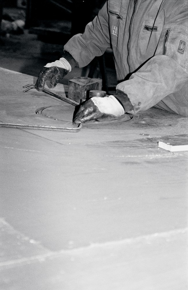 Beton’ere er i gang med at bukke jern. Det arbejde var førhen jernbindernes. Men ”i dag skal vi kunne det hele”, som Børge Rasmussen siger, ”både bukke, binde og støbe”. Hallens portåbninger er lukket med lette træporte, som de har lavet for at holde lidt på varmen i det hundekolde vejr. Man kan ikke se ud på nybyggeriet. Men med ét gør Børge opmærksom på, at den store kran er begyndt at arbejde lige på den anden side af trædøren bag os. Og det åbnede for en hel lille serie af store betonelementers vandring og placering. (De vises senere under nybyggeriet).