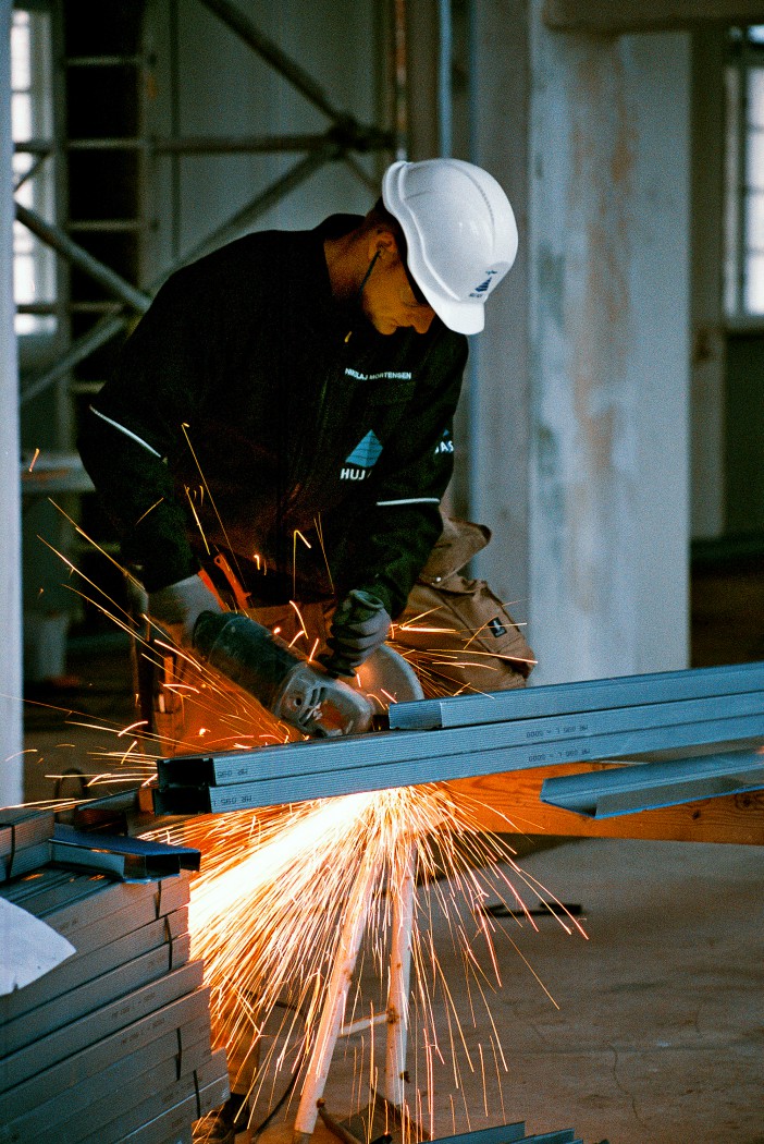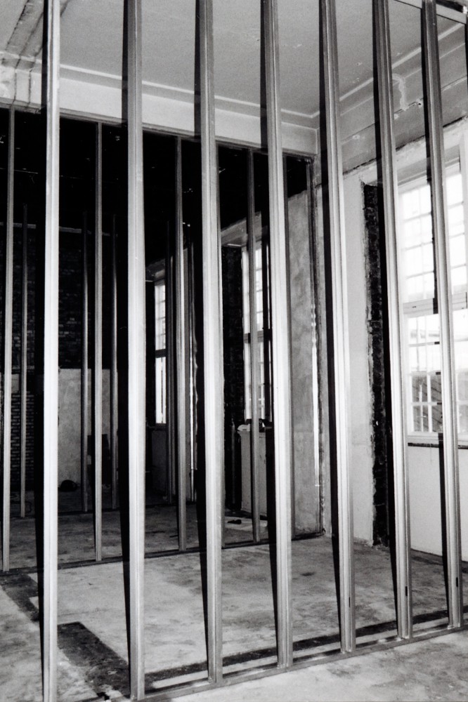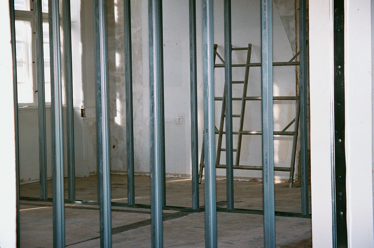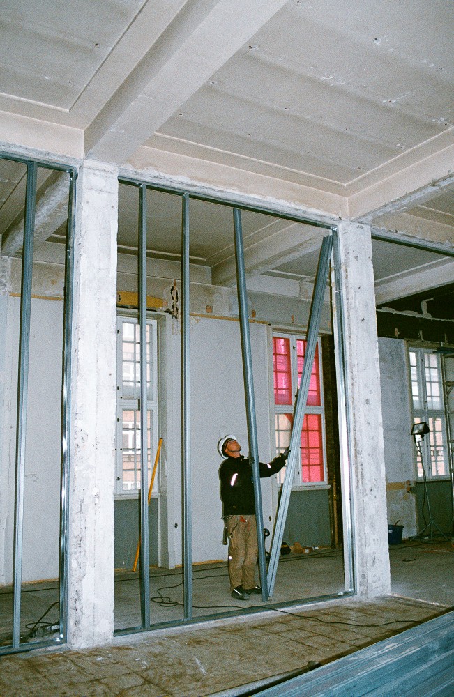 Virkningen af tømrernes arbejde er synlig. Stålskinnerne er rejst, så konturerne af kommende rumadskillelser tegner sig. Endnu kastes skyggerne af solens lys gennem vinduerne i det samme rum. Når gipsen er sat op mellem skinnerne, og hvert vindue har fået sit eget rum, trænges skyggerne ind i hjørnerne. Der er stille i dag, så man hører, hvordan pæle til nybygningen hamres i jorden.