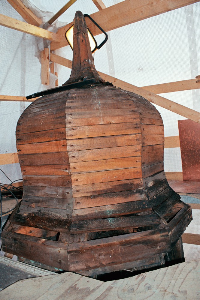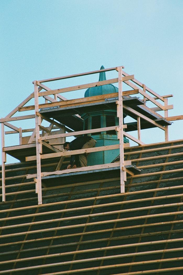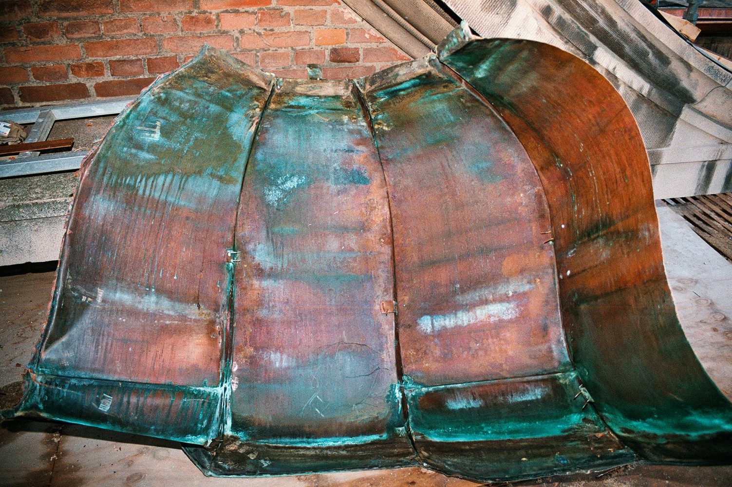 Nedbrydning og opbygning følges ad. En dag ligger pludselig noget bemærkelsesværdigt smukt og fylder gangen på stilladset. Det gamle kobbertårns plader er taget ned og vender vrangen ud, så spor af fortidige kobbersmedes virke kommer for en dag. I det skjulte har et utilsigtet kunstværk udviklet sig gennem 90 års påvirkning af vind og vejr. Synligt bliver det først den dag, det skal skrottes og give plads for et nyt tårn.