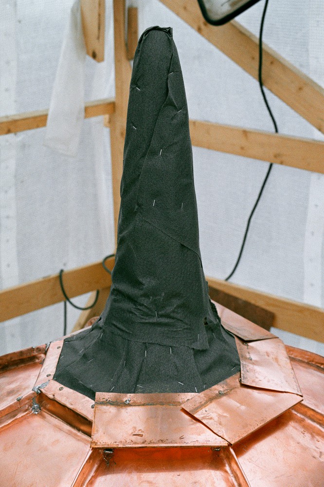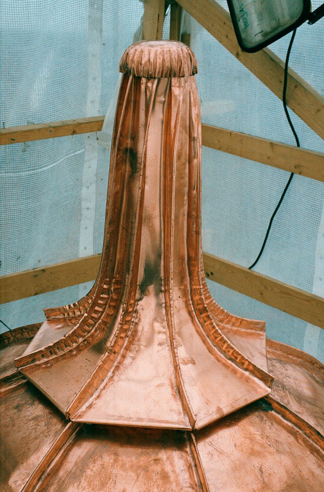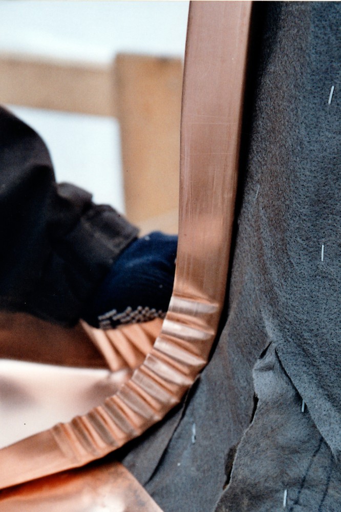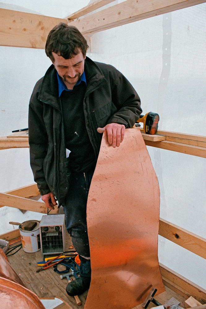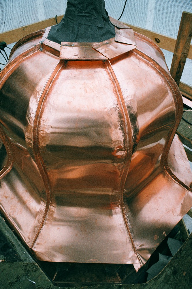 "Kobberpladen tilpasses kuplen på stedet og formes med hammer og tang."