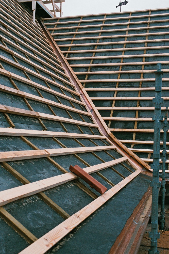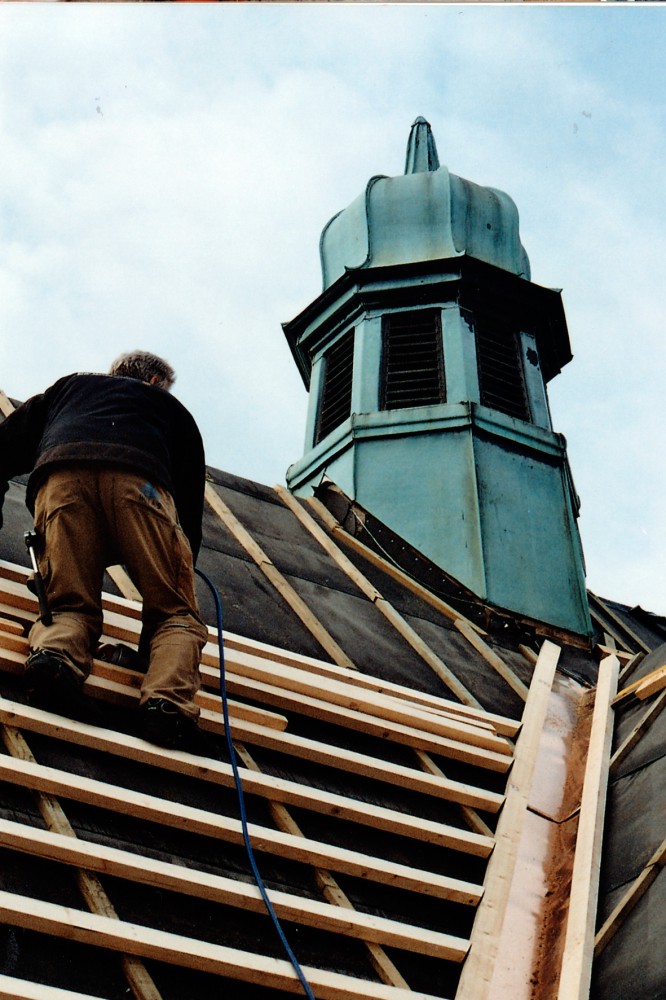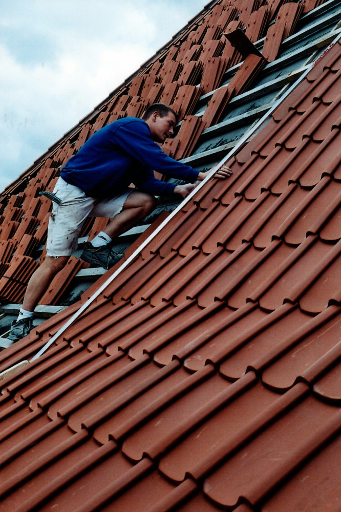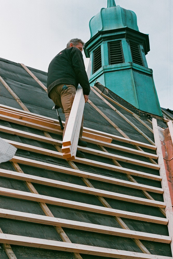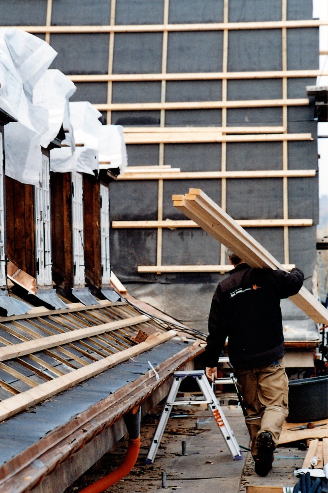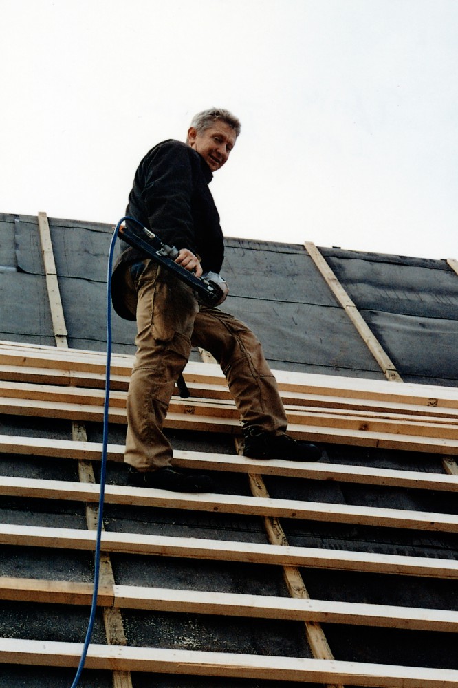 Efter tømreren følger murerlærlingen Ronni Jeppesen. ”Det er første gang, jeg selv skal lægge dele af taget og selv har ansvar for det. Det er spændende. Det er bare at gå i gang. Det er såmænd ikke så svært. Fik her noget viden af Torben og Klaus, murersvende, og så er det bare at gå til det. Man har ikke lært det på skolen. Man kan jo se, hvordan det skal se ud. Der er nogle blå streger på lægterne. Det er ligesom at lege med lego. Jeg synes, det er sjovt med det gamle. Det kan jeg godt lide. Håber det bliver flot. Det når vi ikke at se – alt det, der skal ske, bagefter.”