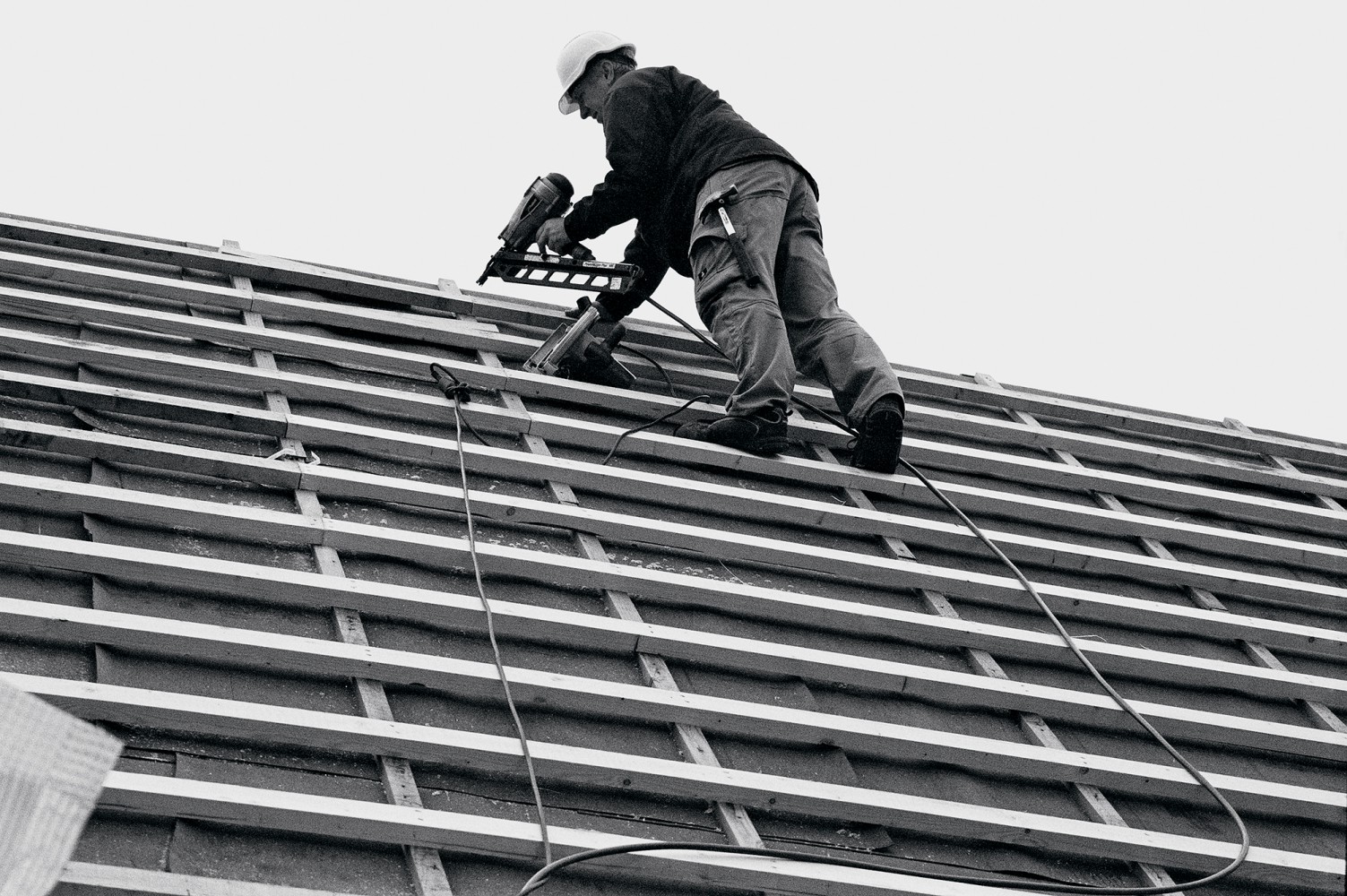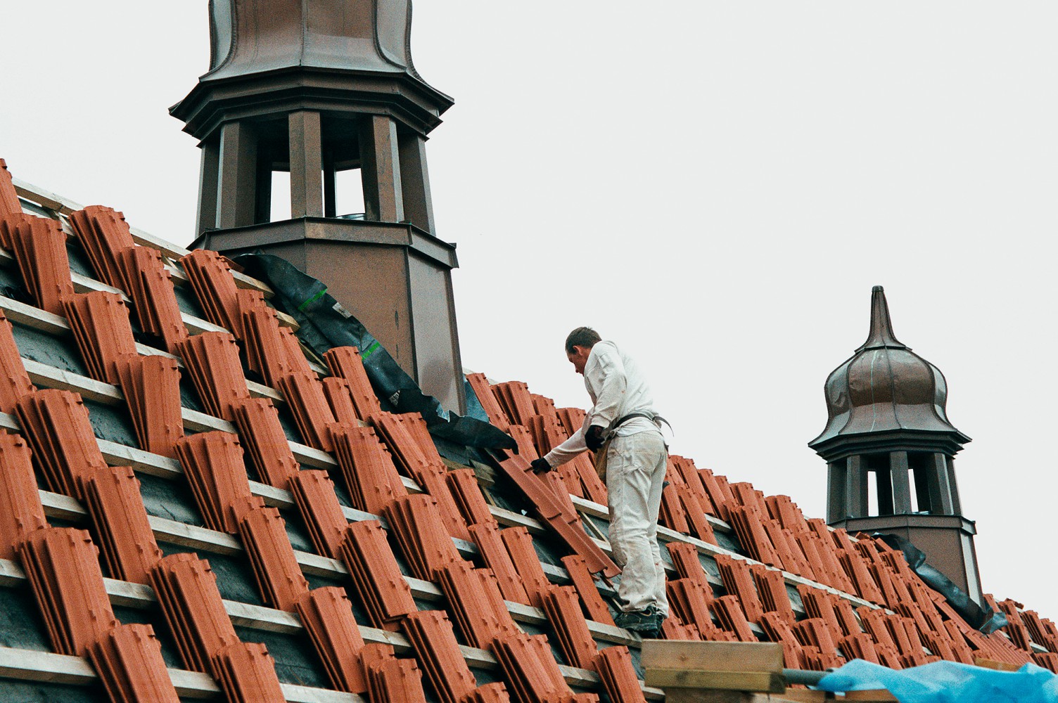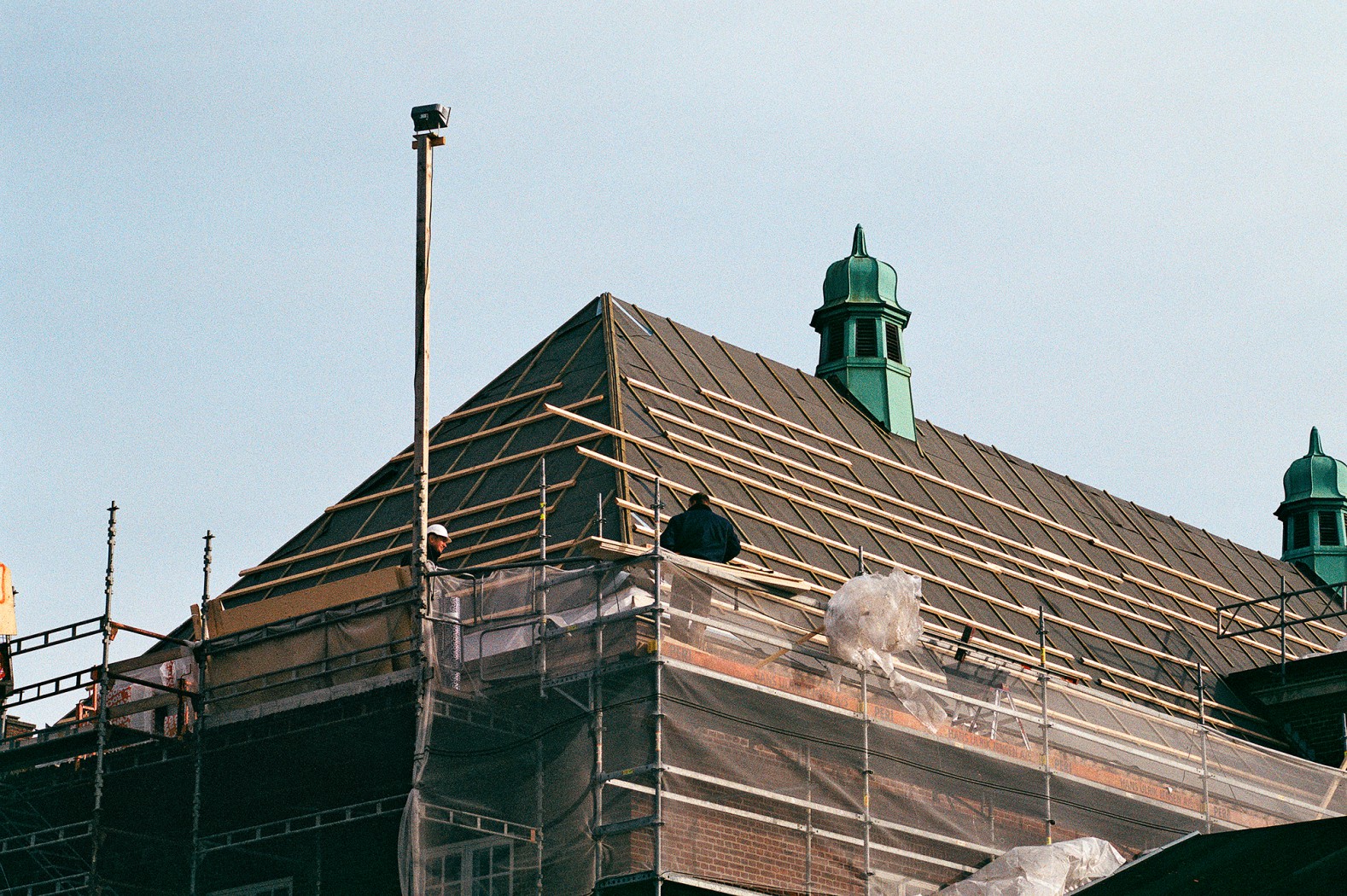 Efter tømreren følger murerlærlingen Ronni Jeppesen. ”Det er første gang, jeg selv skal lægge dele af taget og selv har ansvar for det. Det er spændende. Det er bare at gå i gang. Det er såmænd ikke så svært. Fik her noget viden af Torben og Klaus, murersvende, og så er det bare at gå til det. Man har ikke lært det på skolen. Man kan jo se, hvordan det skal se ud. Der er nogle blå streger på lægterne. Det er ligesom at lege med lego. Jeg synes, det er sjovt med det gamle. Det kan jeg godt lide. Håber det bliver flot. Det når vi ikke at se – alt det, der skal ske, bagefter.”
