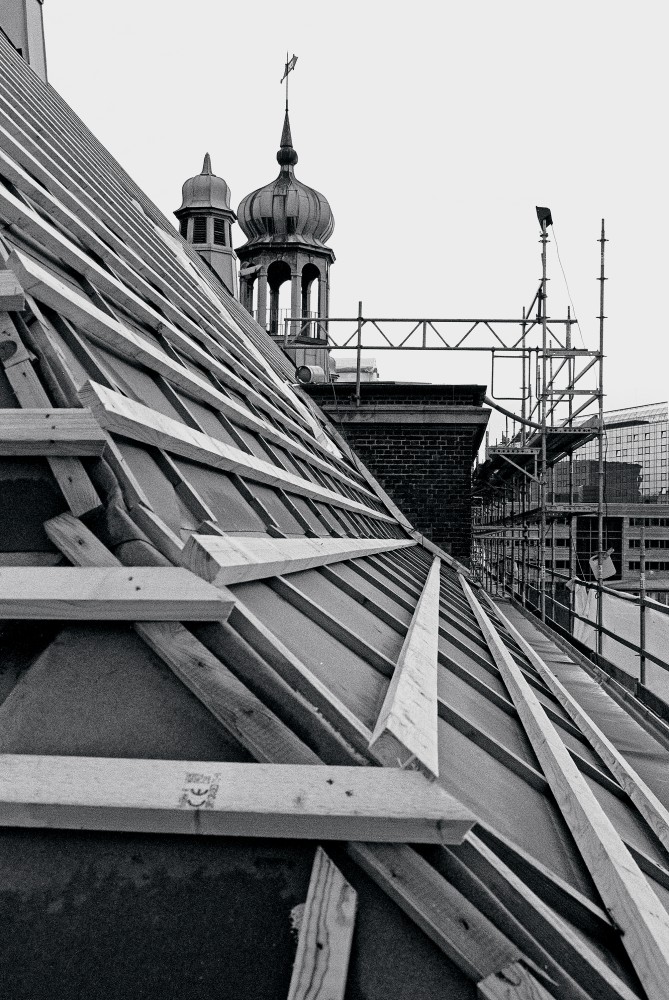 På fotografierne kan man ikke se, at der er lavet et fast undertag, som sikrer at bygningen er tæt, men det har arkitekten Finn Larsen fortalt. Førhen gav støbejernsvinduerne dagslys til loftet, blandt andet til nytte under inspektion af taget. Nu er de gjort overflødige.