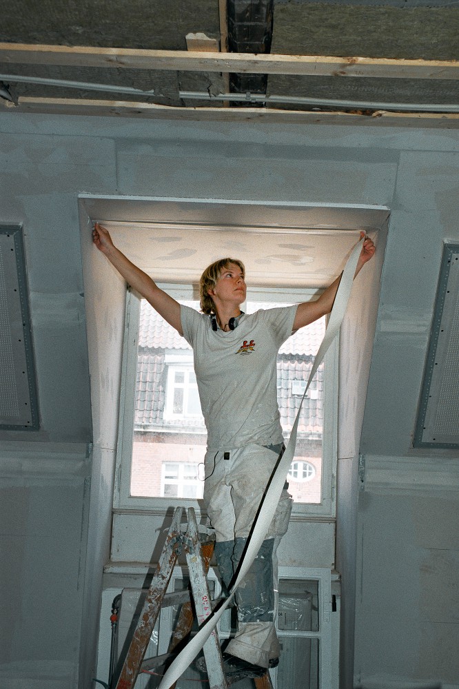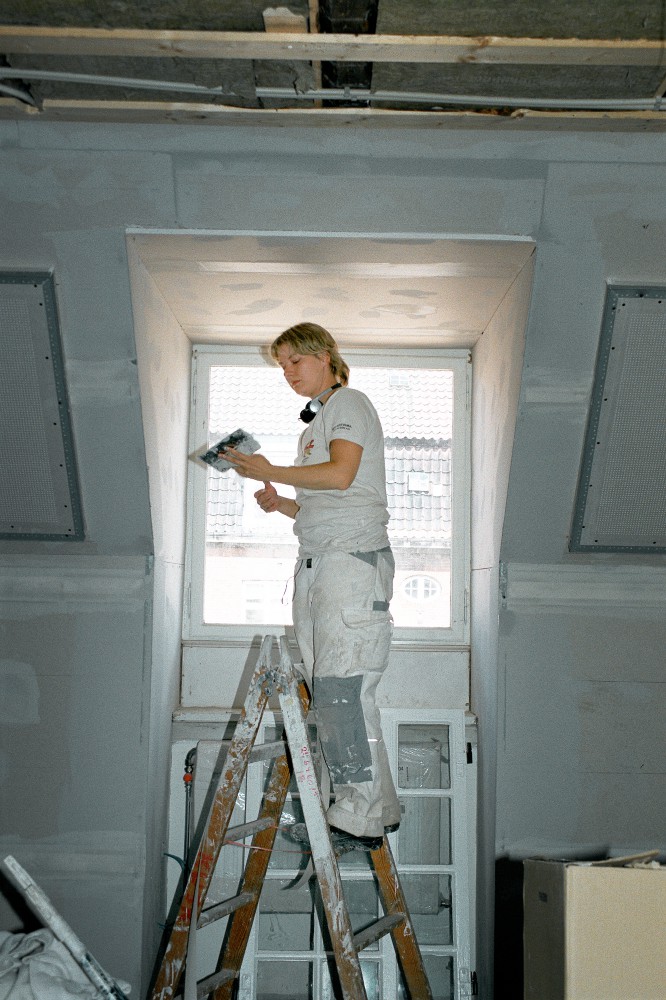 Malerne kommer som den sidste faggruppe. I juli 2011 står Heidi Jørgensen på stigen på anden sal og arbejder: ”Interesserer mig for byggeri og alle de håndværksmæssige arbejder. Det er spændende at gå i noget, der har en sjæl i forvejen – lave nyt og bevare det gamle. Her på 2. sal pakkes det gamle ind, men noget bibeholdes – søjlerne, så huset stadig kan fortælle sin historie. Vigtigt, at man ikke bare laver det hele om, så det bliver nyt. Vi kan følge, hvordan det hele skrider frem, og hvordan det ændres. Og vi malere får lov at lave det synlige arbejde, finishen. Vi ser det færdige.”