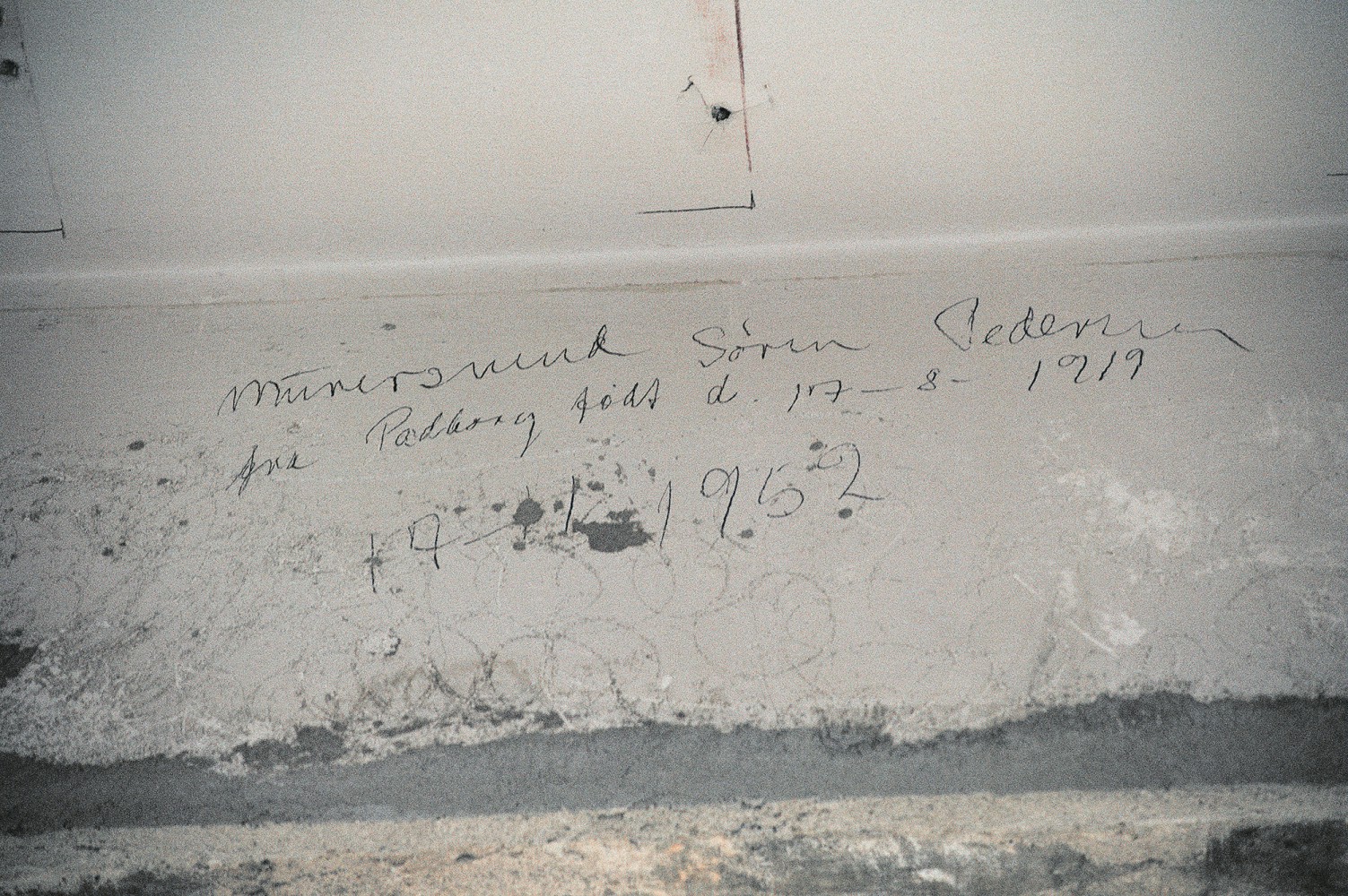 En januardag 2011 har tømreren Finn Sørensen gjort et fund. Højt oppe på det blotlagte, hvidgrumsede loft står der: Murersvend Søren Pedersen/ fra Padborg født d. 17.-8-1919/ 17-11 1952.” Sådan skrev han sig i 1952 ud af anonymiteten, så hans navn kunne blive genfundet 59 år senere af den arbejder, der rejste skelettet til nye ruminddelinger med sænkede loftkonstruktioner. De vil atter skjule murersvendens navnetræk. Men også de nye lofter kan fjernes, og da vil en tømrers navnetræk, adresse og timeløn også kunne findes. Men det er en hemmelighed indtil videre.