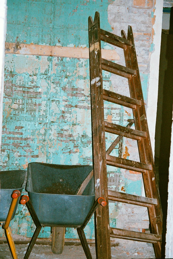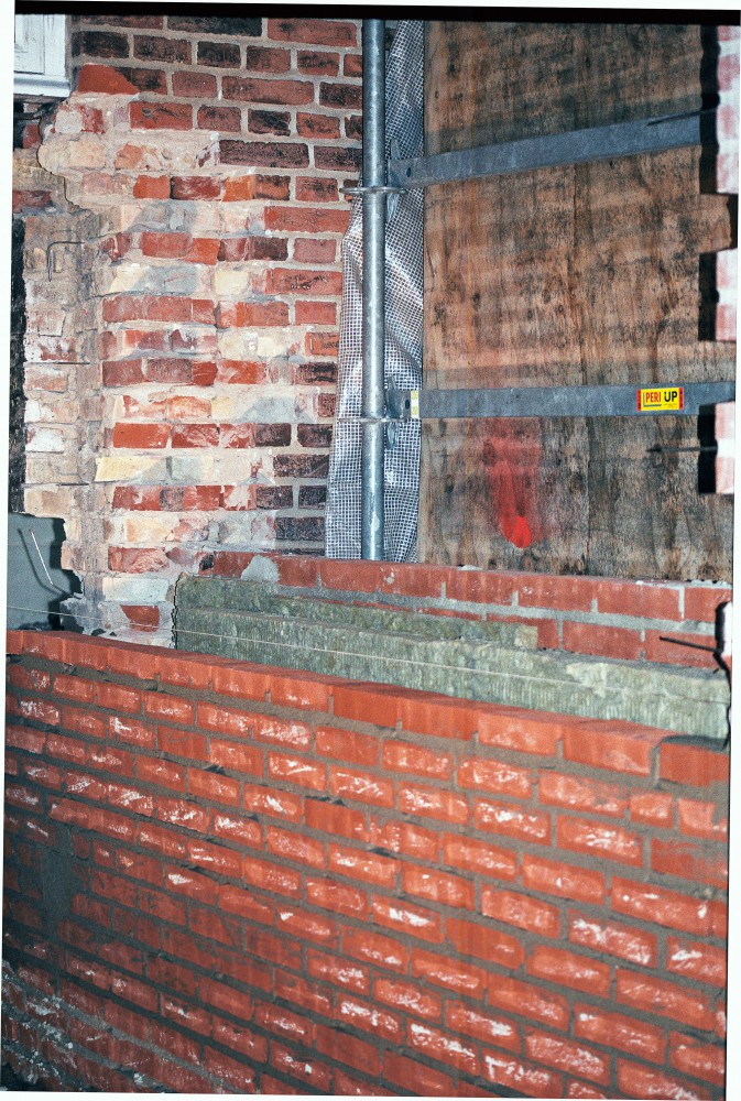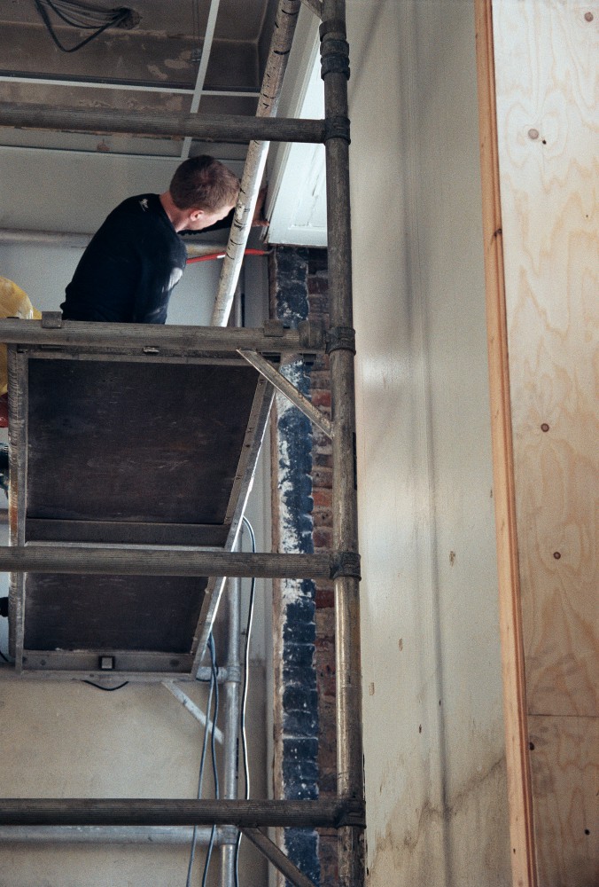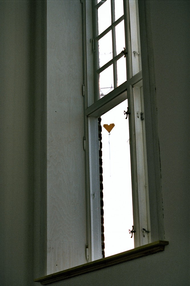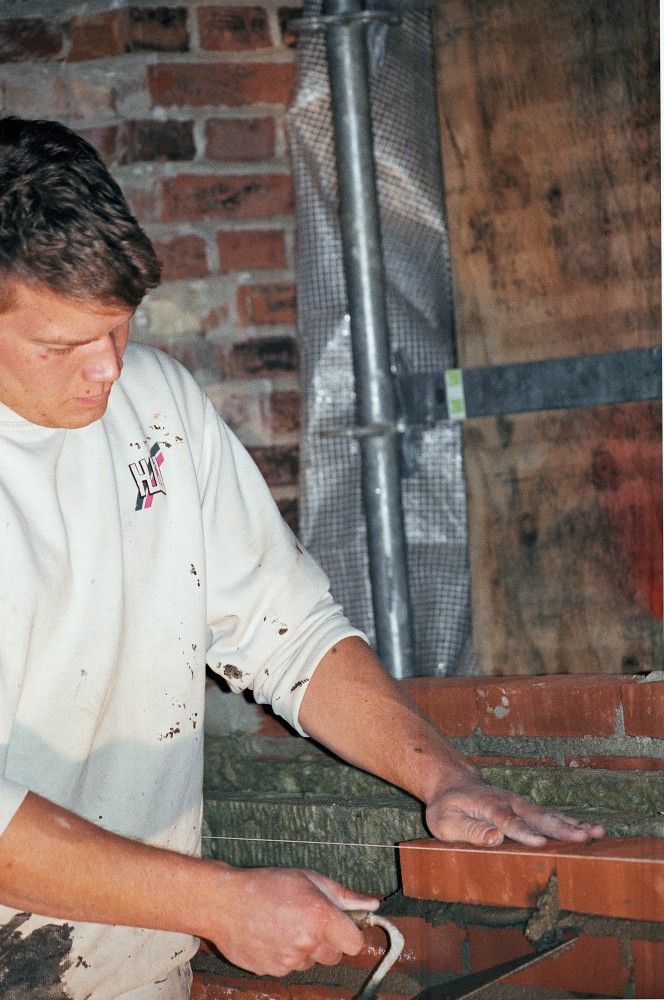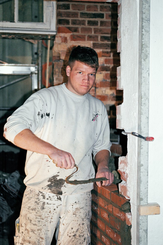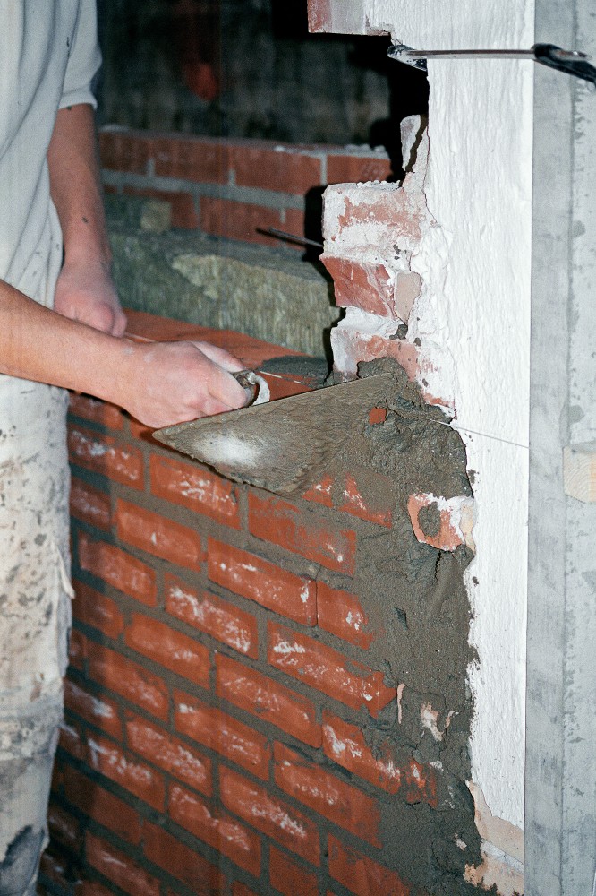 I lang tid har der været åbent i murværket mellem nordhallen og mezzaninen, men kort før jul er den snart udlærte murerlærling Tim Voss i gang med at mure op. ”Det er rart endelig at lave det. Det er dejligt at mure: lægge nogle sten og se, at det forandrer sig. Det her er godt arbejde.” Vi kan begge høre, hvordan lydene ændrer sig, i takt med at muren bliver højere. Og fornemmelsen af rummet forandrer sig gradvis. Når muren først er færdig, dør lyden.