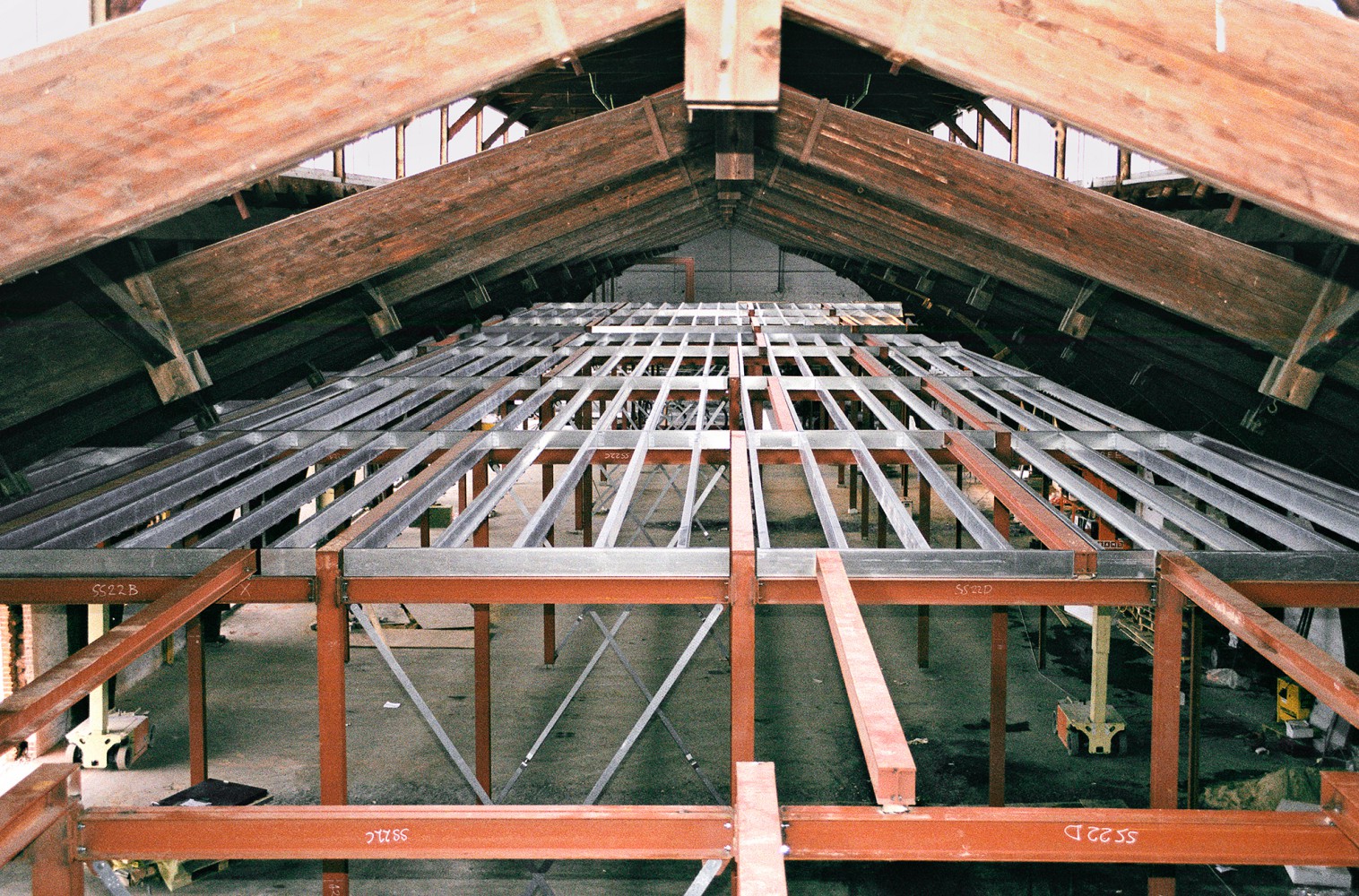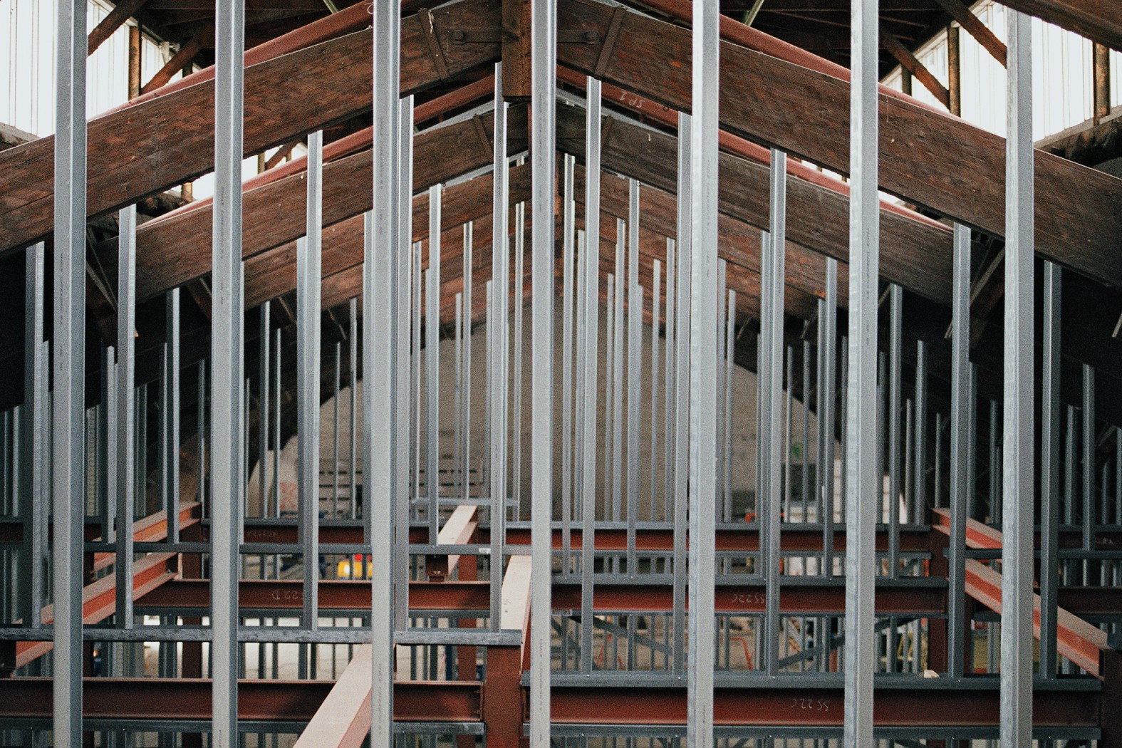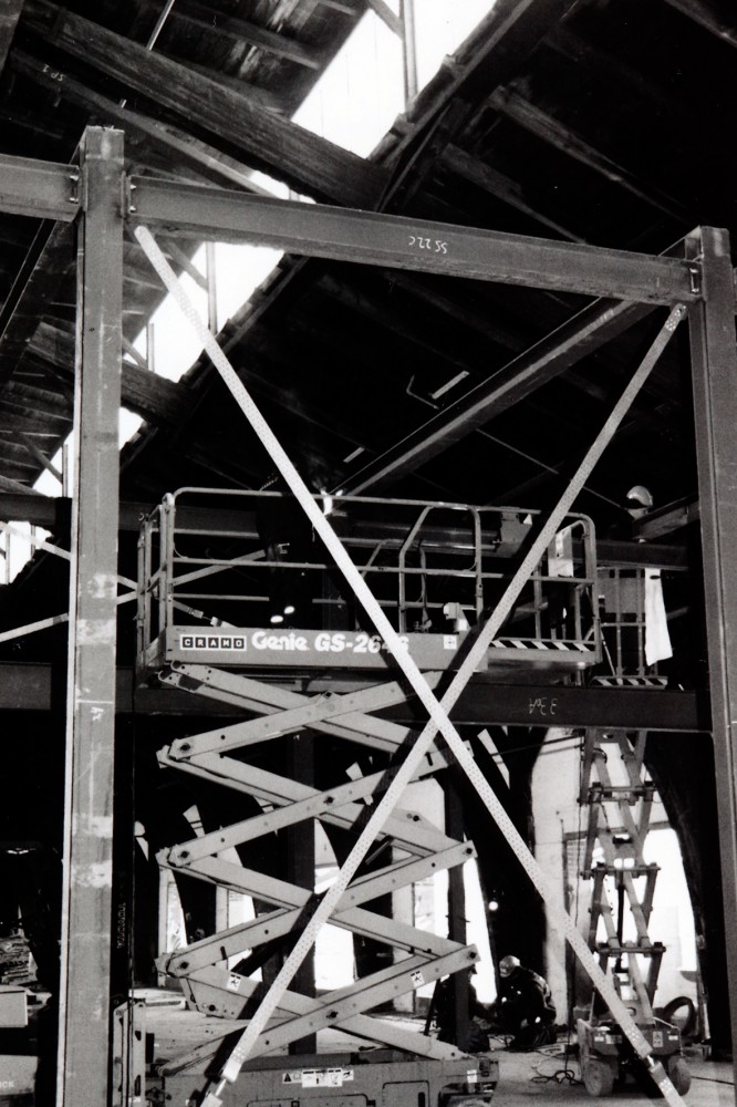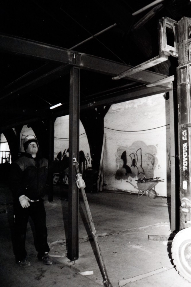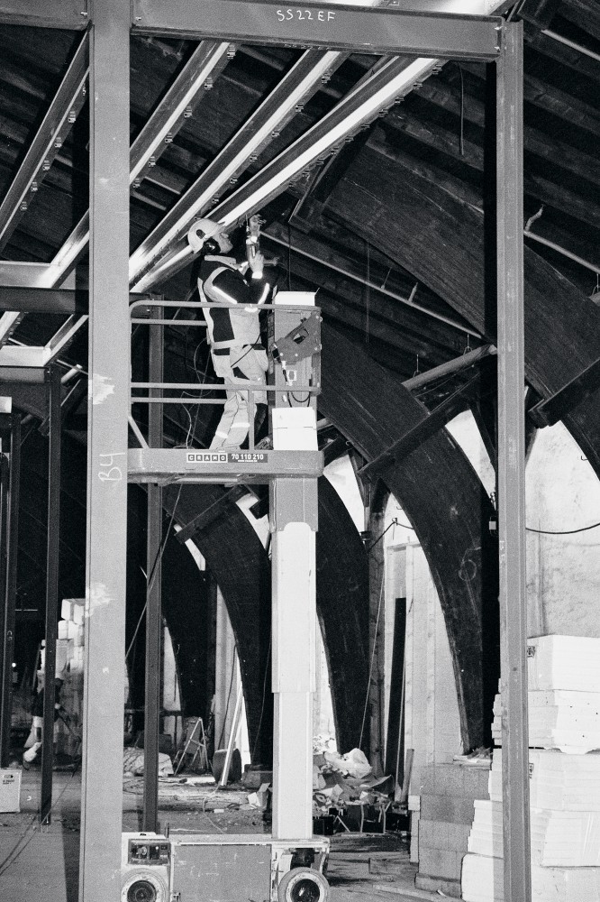 Smedene og herunder Mikael Petersen er ved at lave rum i hallen. ”Det er noget nyt at lave en bygning i bygningen for at bevare den ydre skal. Når man bygger nyt i stål og det gamle er i træ, så skal det kunne arbejde sammen. Stålet er meget påvirkeligt af kulde og varme. Så et ståltag arbejder meget.