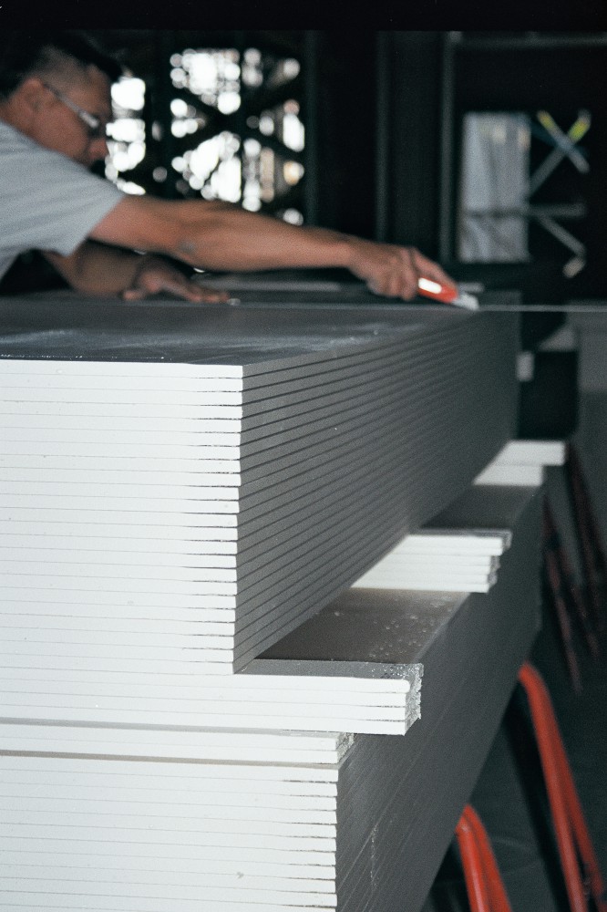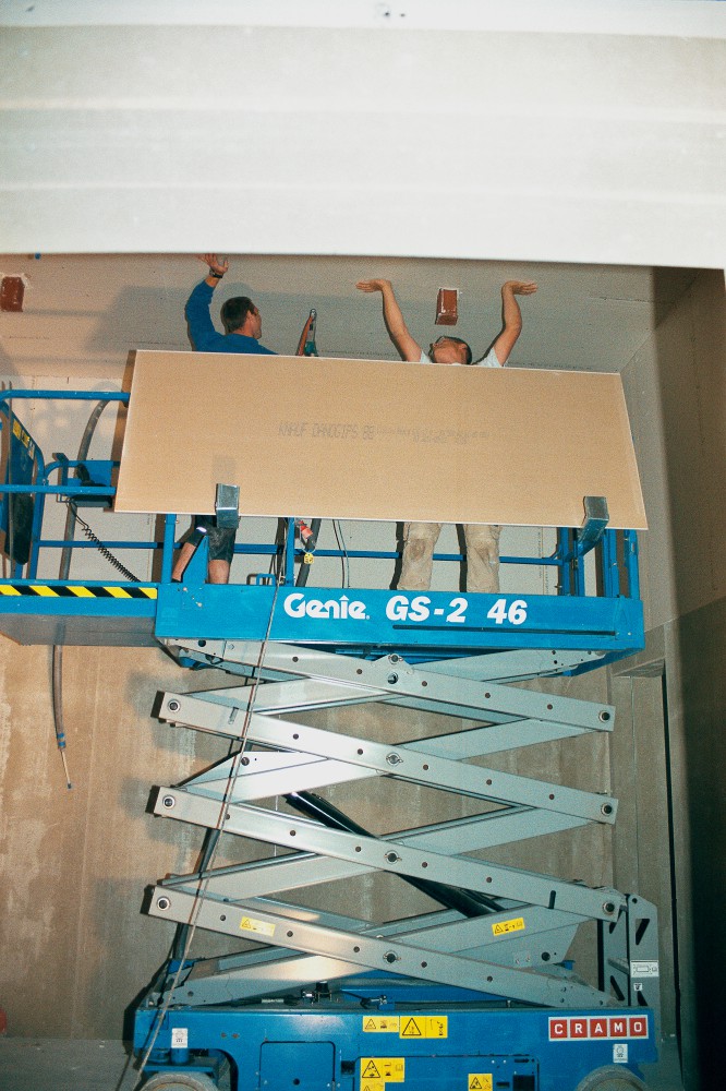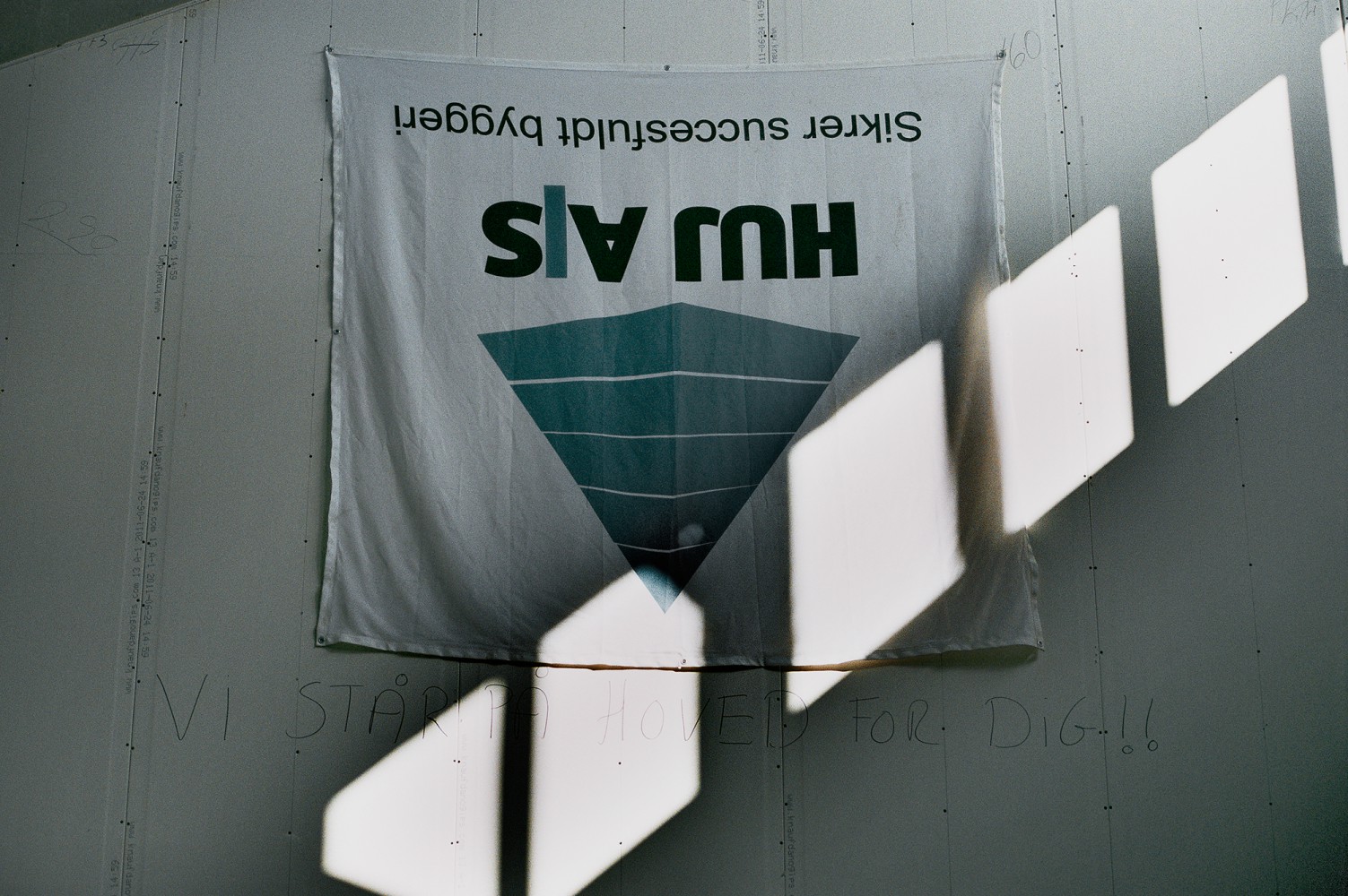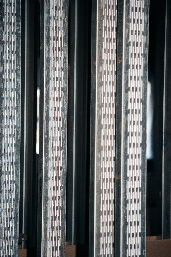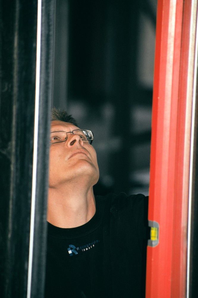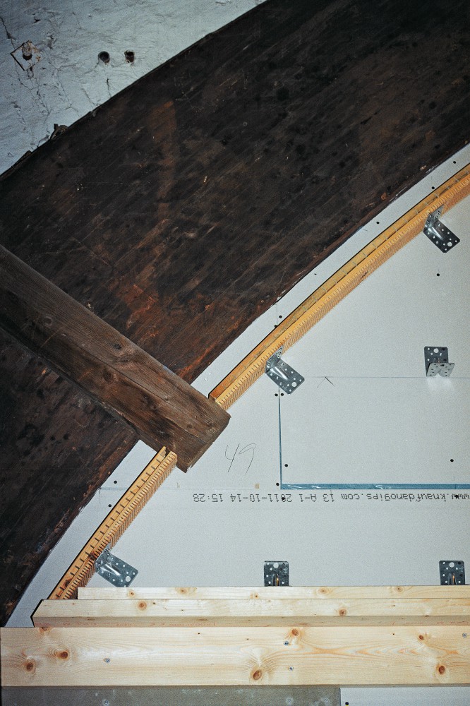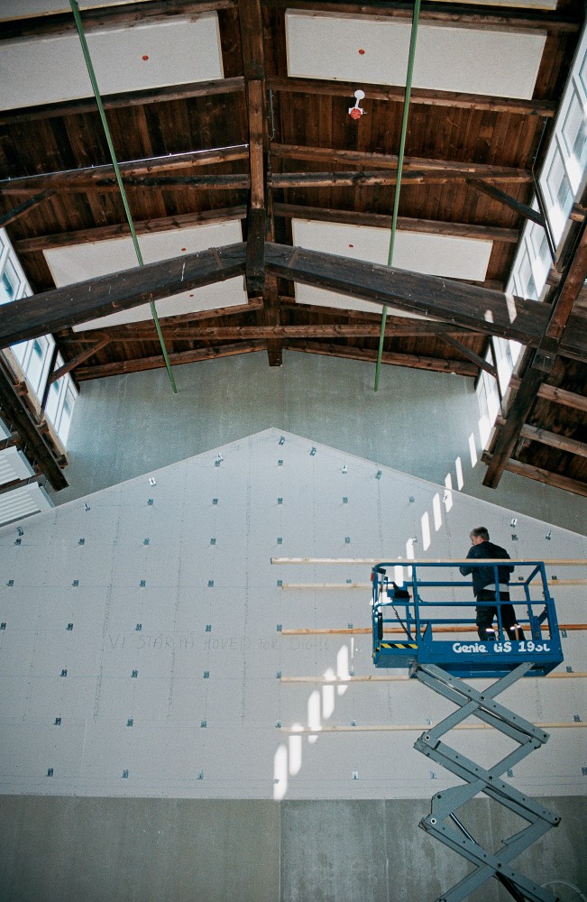 El-liften skal til hjælp, for billedet skal tages helt nær på. Beslagene tjener som støtte for efterfølgende vandrette lægter med isolering og Troldtekt imellem. Og derfor går det, som makkeren Finn siger: ”Alt det vi laver, bliver gemt.”
