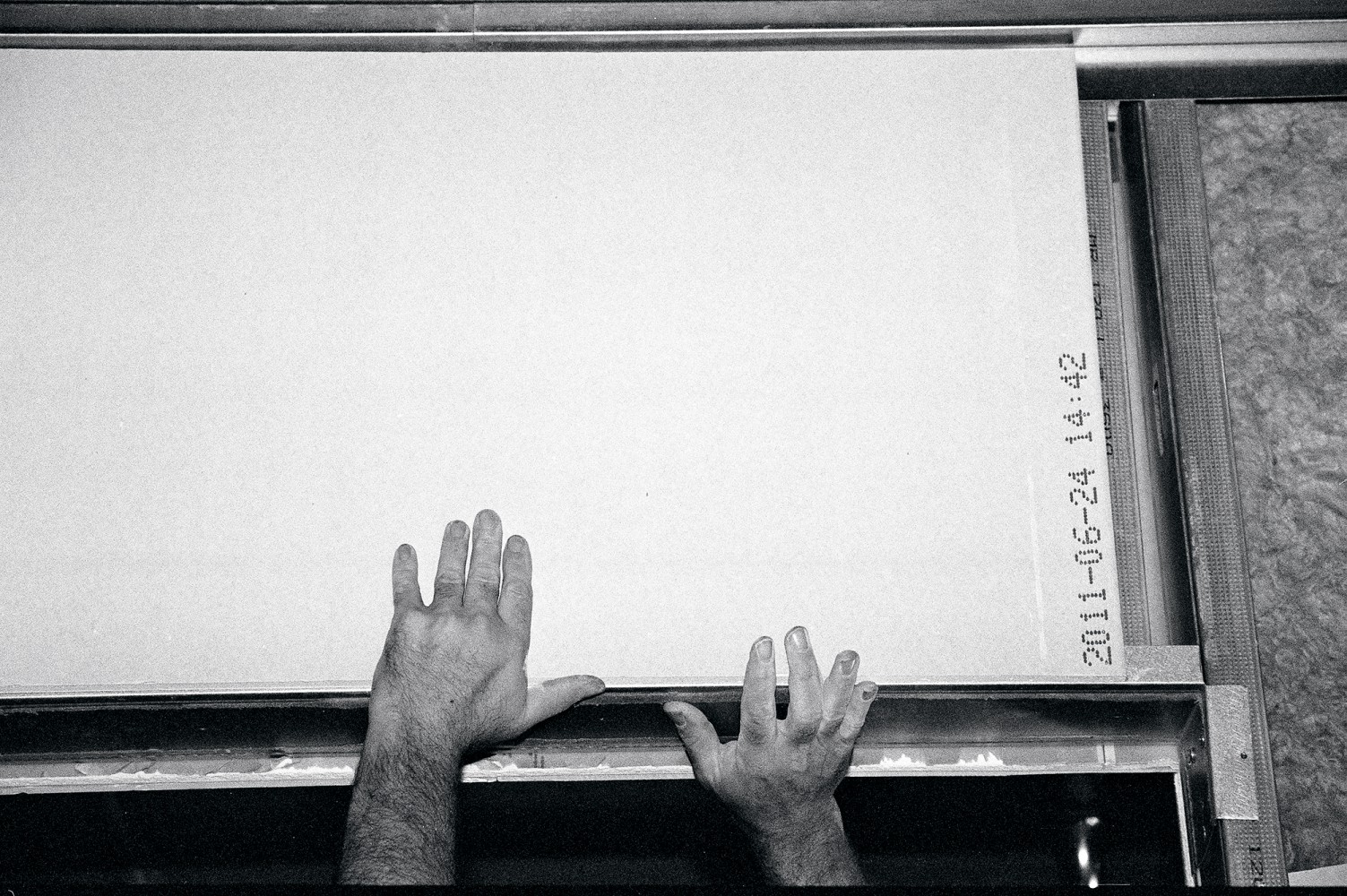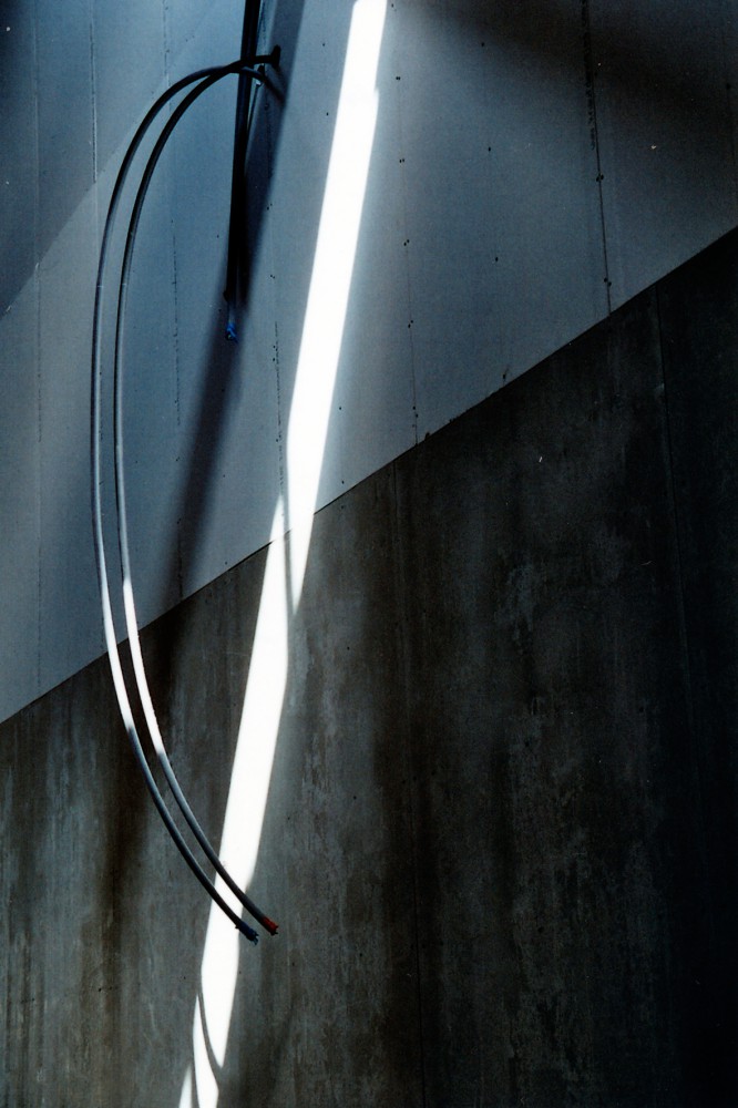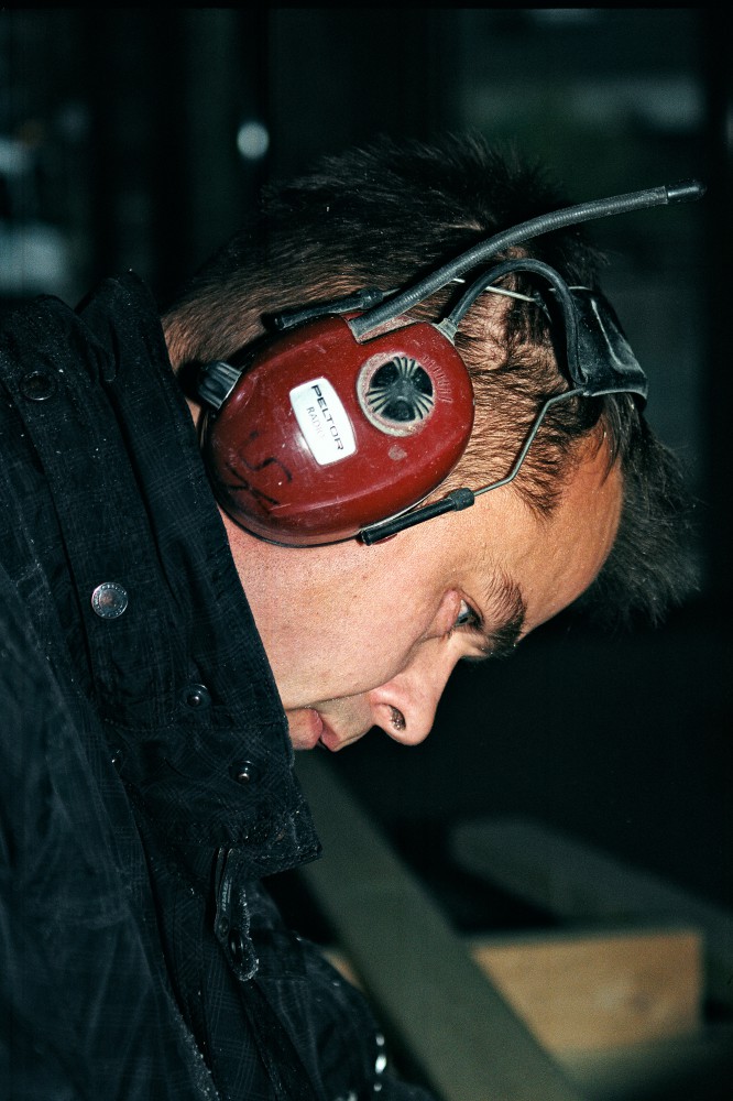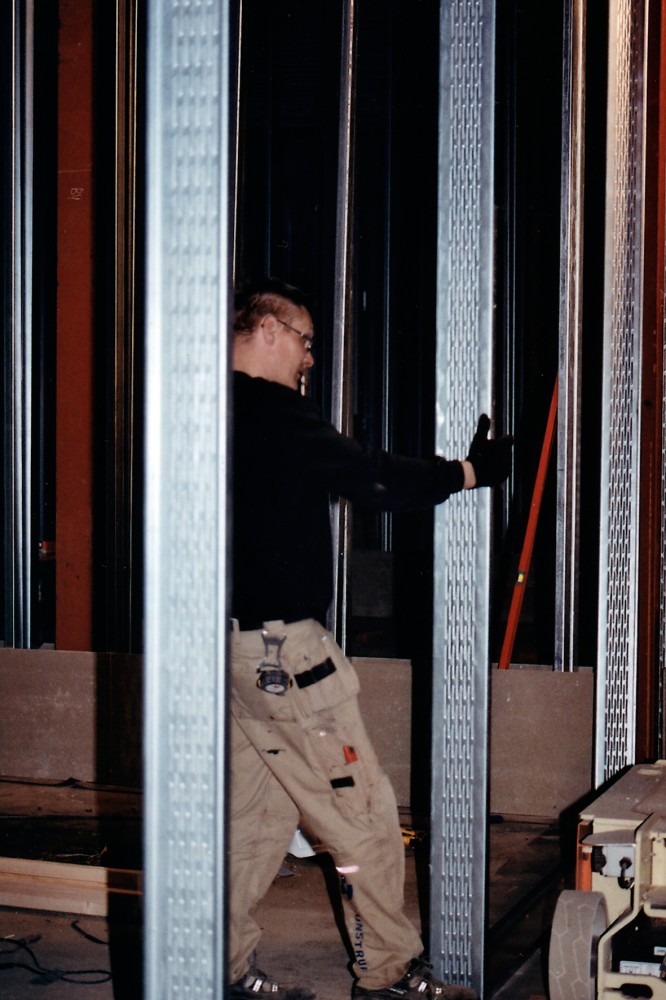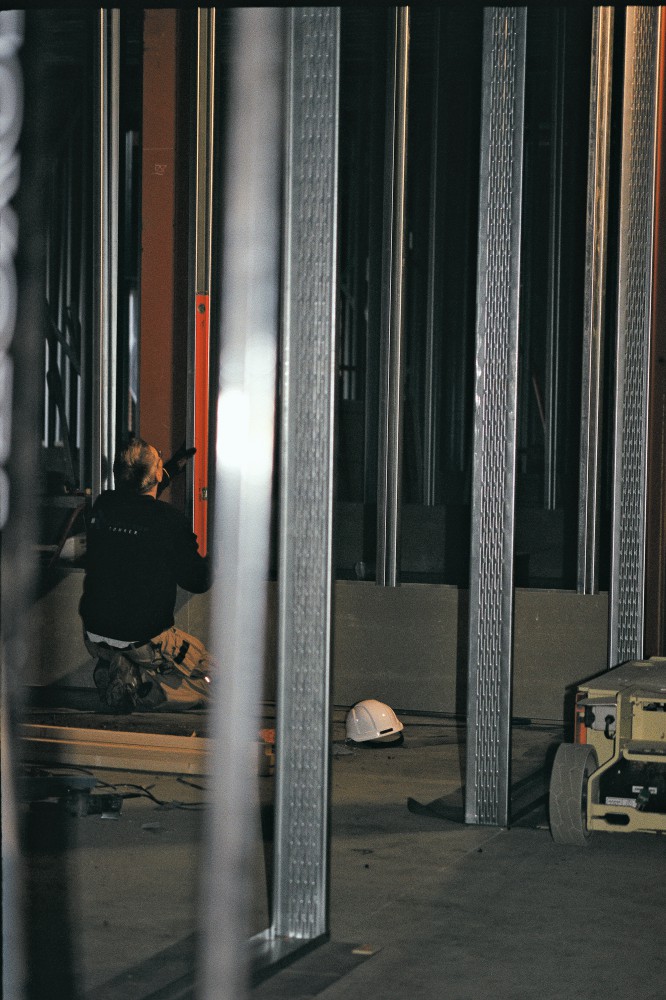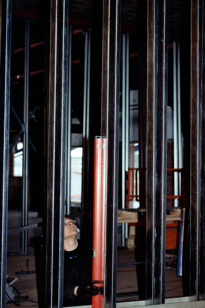 Tømreren retter stålpiller til. For når der først er støbt gulv ind omkring de cementspånplader, der er sat op nederst mellem stolperne, kan disse ikke længere rokkes den mindste smule. Vi taler om byggeriet nu, hvor han sidder som i en skov af stålpiller: ”Hvis man tog nogle andre briller på, kunne man se, at det er smukt. Men det er kun midlertidigt. Alt bliver skjult ret hurtigt. Står kun sådan ganske kort tid. Men se dér: Stålet får et eget udtryk, dér hvor den stærke lampe lyser.”