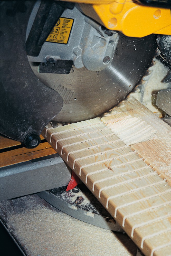 Med geringsav skærer han i regler og forskallingsbrædder riller, så træet kan bøjes, ”så vi kan følge arkitektens tegninger. Så arkitekten kan få sin vilje”, føjer han grinende til. ”Det tager tid. Og det er sjovt at lave og at lugte lidt af savsmuld.” Sådan genkalder han sig ”tømrerfagets hemmeligheder gennem 2000 år”, her en gråvejrs onsdag i oktober.