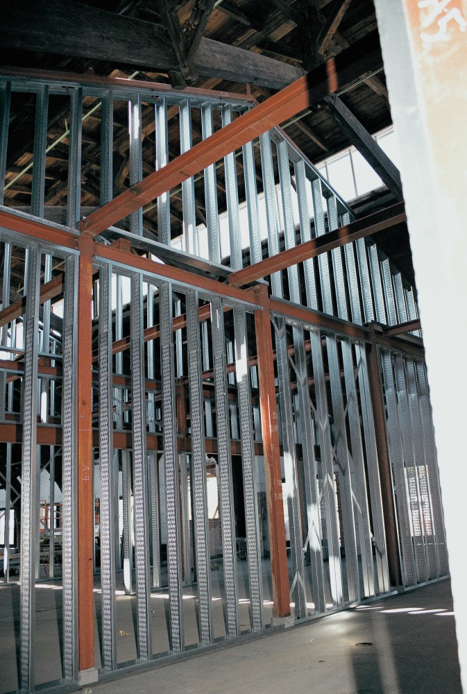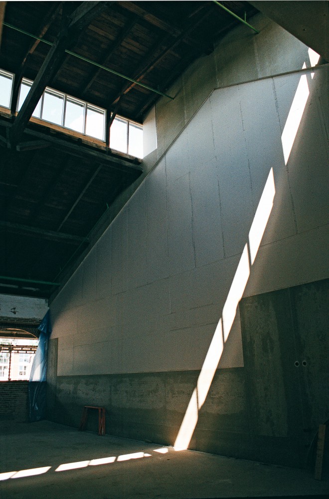 Nordhallens vestligste afsnit er det sidste, der får rum i rummet, og indtil da er det opbevarings sted for materialer, så arbejderne går fra og til som tømrerne Finn Sørensen og Søren Kristensen. De har arbejdet sammen i 12 år. Det er også dem, der kommer til at bygge det rum op i den del af hallen, som bliver metalværksted i Byens åbne værksteder. Da jeg møder dem den 26. oktober 2011, siger Søren: ”Det her skal fotograferes!”