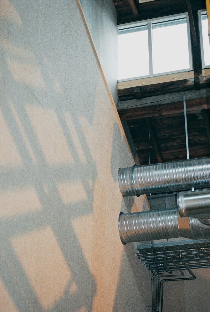 ”Det er overfladerne, der skaber en bestemt rumklang. Vægbeklædningen er optimeret totalt her. Alle vægoverflader er beklædt med lydabsorberende overflader. Alle værksteder har fået Troltekt på væggene og forneden nogle komprimerede cementspånplader, der skal kunne klare slid. I akustiskregulerende materiale skal man have huller, der tillader lyden at gå ind og blive dræbt inde i hullerne. Troldtekt har netop små huller i sig, og så har det bagvedliggende materialer, der dræber lyden.” (Arkitekt Finn Larsen)