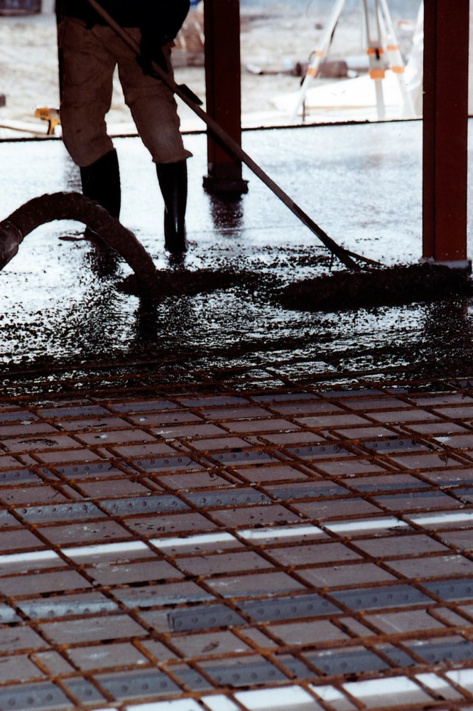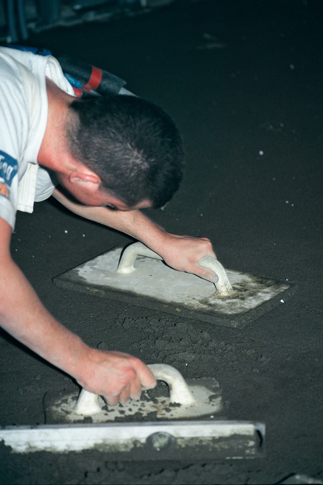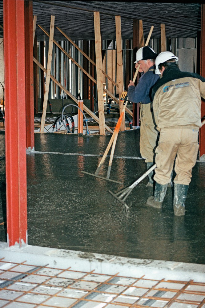 I den østlige del op mod hovedbygningen er der begået en fejl, så hele slidlaget skal i den del af hallen laves i hånden. Betoneren Børge Rasmussen med lærlingen Johnny Arland og mureren Niels Nymann slider i det. Niels siger: ”Det er hårdt for knæ og ryg, som belastes. Man trækker af med ryggen. Det er hårdt at ligge på knæ en hel dag. Styrketræning er godt for kroppen, så kan man bedre tåle belastningen.”